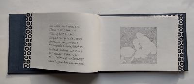 The 76 pages in 4 leaflets contain about 30 illustrations and handwritten lyrics (in german only) by Anna Achmatowa, Boris Pasternak, Daniela Danz and others. A unique piece (2021). Please mail me for further information. The book is presented in a matching handmade box (22*31*4 cm). (UNIKAT 1000,-€)